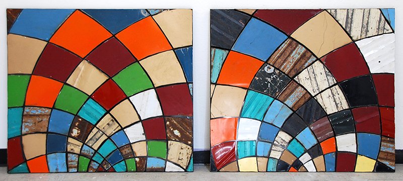 Medium: Mosaics of cut licence plates mounted on brush steel and acrylic paint on wood.
